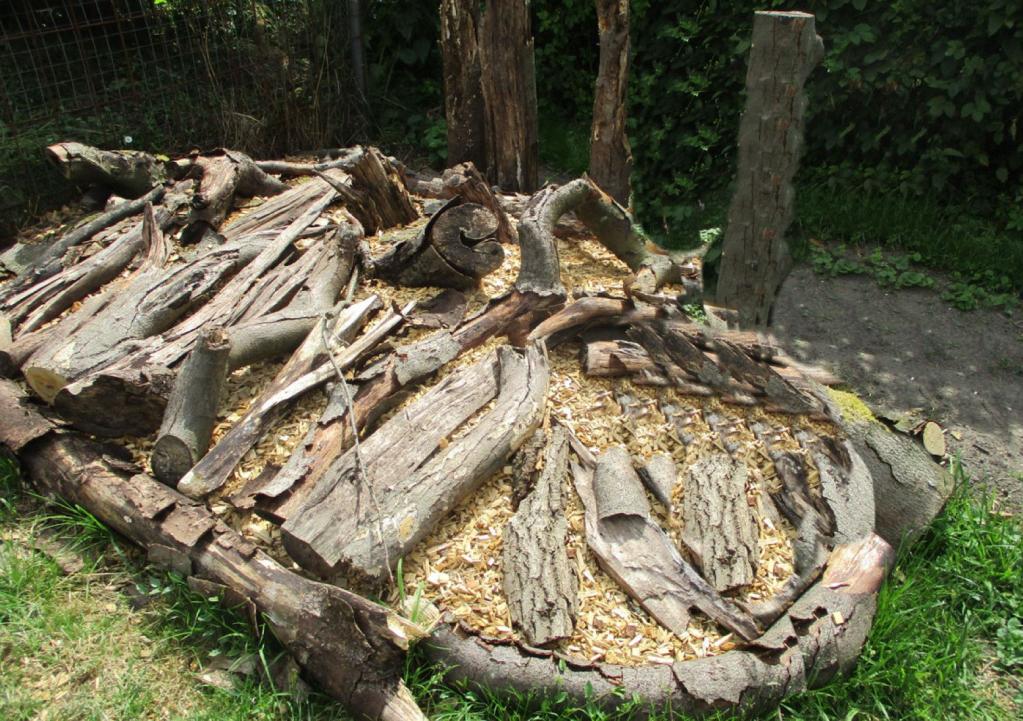 Füllen sie das Loch mit großen und kleine Totholzstücke, wie Baumstämmen, Holzscheiten und Ästen. Es können ruhig verschiedene Holzarten gemischt werden.